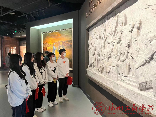 同学们通过参观博物馆了解到在1866年的中国,船政于福州马尾诞生。造舰船、办教育、育人才、兴海军、试飞机,船政成为近代中国探索国家自强之道、复兴之路的先锋阵地。该博物馆充分展示了近代中国人民的强烈爱国精神与自强精神,这种精神是在近代特定的历史时期形成的,是中国传统文化和民族精神不可或缺的一部分。同学们参观的不只是一处遗址,它更是一个百年历史的见证,身为新时代青年,要从中学习立志进取、积极作为、不忘历史、自立自强等优秀精神品质,承担起应有之责。一座船政博物馆,半部海事图强史。走进博物馆一层大厅,一组古铜色的主题浮雕随即映入大家的眼帘。浮雕上巧妙地结合了诸多的船政要素和海洋元素,正中是一艘乘风破浪的军舰,它以船政制造的第一艘军舰“万年清”为原型塑造,象征着船政冲破旧时代的枷锁,追寻近代化的光明,在实现中华民族伟大复兴的蔚蓝色大海上扬帆起航、劈波斩浪。注视眼前的铜雕,同学们也同样深切地感受到了中华民族向海图强、伟大复兴的磅礴气势。