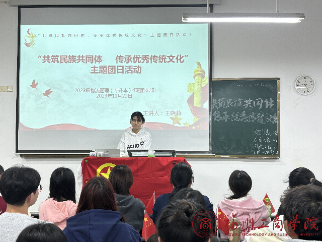 为深入贯彻党和国家铸牢中华民族共同体意识的要求,将中华民族共同体意识融入高校思想政治教育工作,2023级物流管理4班于2023年11月22日组织开展了以“共筑民族共同体,传承优秀传统文化”为主题的团日活动,让民族团结意识和爱党爱国情怀在员工的心底扎根。本次活动由团支书王晓莉同学主持,刘敏君辅导员参加。