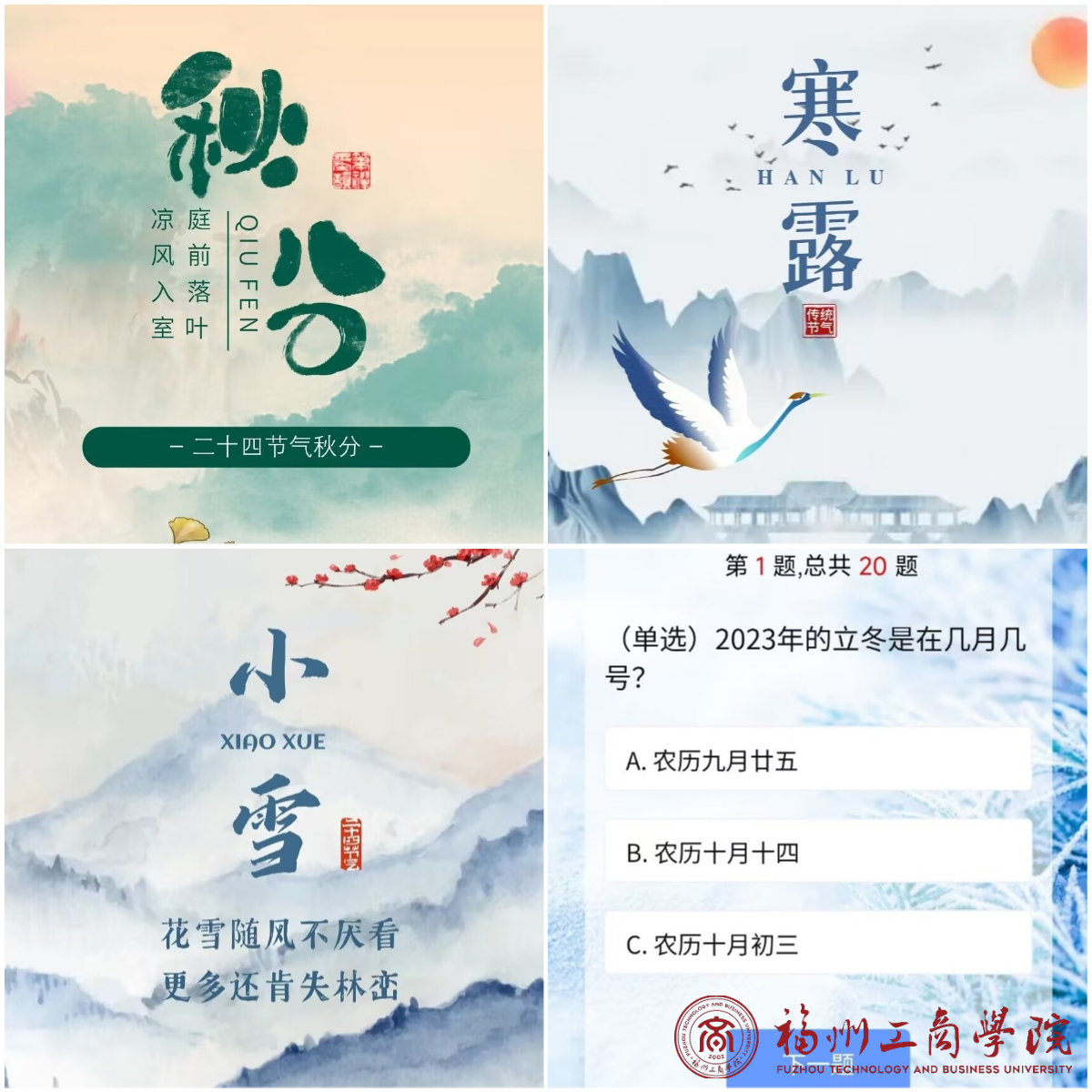 活动采用一个节气和一个专题知识为一期展示内容,总共采用了秋分、小雪、大雪、立冬、霜降、寒露六个节气,与中秋节、亚运会卫星发射、全球变暖以及重阳等专题相互融合,通过H5链接相关展示。随后,会通过结尾小测试来巩固知识。让同学们从美轮美奂的画面之中,体会到祖国历史文化的独特魅力,自觉传承中华优秀传统文化。