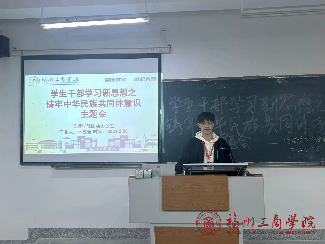 会议伊始,员工干部林嘉宏向全体成员简单介绍了中华民族共同体的内涵,引出了铸牢共同体意识的重要性。随后指出,作为新时代新青年,要深入学习领会、认真贯彻落实,扎实推进中华民族全体成员结成的利益共同体、命运共同体和责任共同体。最后,由陈瑞琼同学,上台分享关于自己对铸牢中华民族共同体的心得,总结出铸牢中华民族共同体意识是满足各族群众美好生活向往的必然要求。只要各民族手挽手、肩并肩,共同努力奋斗,各族人民的日子就一定会越来越红火,就一定能共建美好家园,共创美好未来。