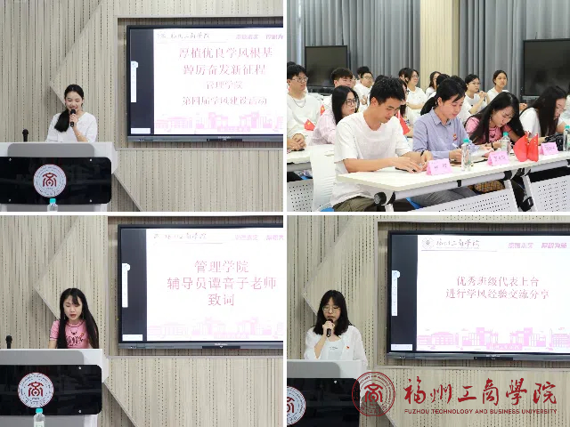 活动伊始,全体成员起立,奏唱校歌。随后辅导员谭音子老师致开幕词,强调同学们应以此次学风建设活动为契机,树立正确的学习态度,养成良好的学习习惯,促进良好学风建设;紧接着,宣读获奖班级,与会老师为2023-2024学年学风建设中表现突出的班级颁发奖状证书,获奖班级为2021级旅游管理1班获得本次学风建设评选活动一等奖,2021级工商管理1班、2021级人力资源管理1班获得二等奖,2023级物流管理1班、2023工商管理(专升本)1班、2023级工商管理(专升本)4班获得三等奖,继而,优秀班级员工代表陈曼雪同学上台分享经验与心得,激励同学们在今后的学习和生活中要坚定理想信念,以“梦想”为翅、以“勤奋”定规,以“毅力”求成,保持攻坚克难的干劲、乘风破浪的劲头和向前奔腾的动力,聚力聚心聚意,共同创造申博sunbet更灿烂的明天。最后,公司团委书记张春梅老师致闭幕词,肯定了本次活动举办的意义,要求以优秀班级作为榜样,呼吁全院向优秀班级学习、携手共进,让公司的优良学风得以延续和发扬,为公司的长远发展奠定坚实基础。