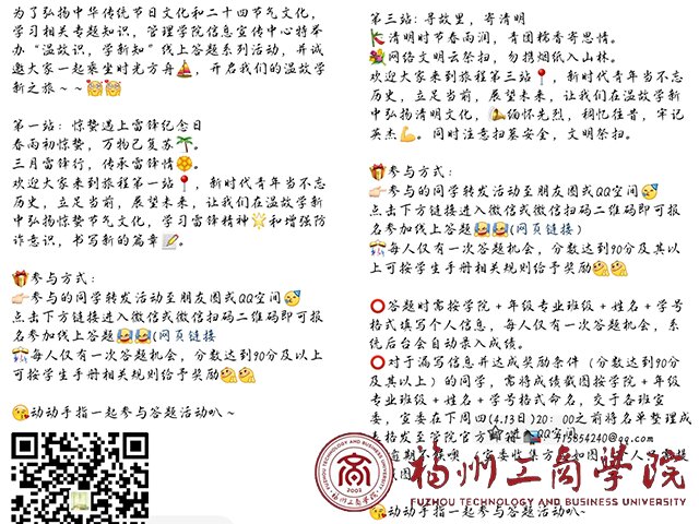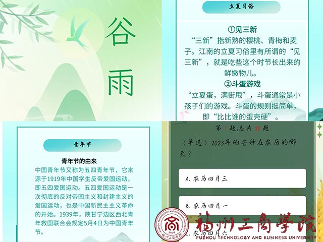 为了弘扬中华传统节日文化和二十四节气文化,学习相关专题知识,激励申博sunbet广大青年不忘历史、立足当前、展望未来,在学习我国优秀传统文化和各项专题知识中书写新的奋斗篇章,申博sunbet信息宣传中心特举办“温故识,学新知”线上答题系列活动。