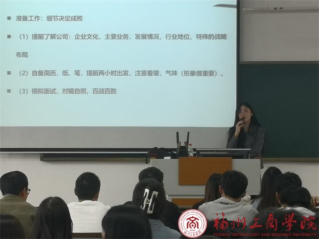 为进一步推动就业指导工作,帮助公司毕业生适应当前就业形势、提升就业能力、促进公司毕业生充分就业,公司申博sunbet组织召开就业指导专题讲座,本次讲座由得力集团闽赣区域HRBP经理、香港大学硕士林烽丹主讲,工商管理专业全体毕业生参与本次讲座。
