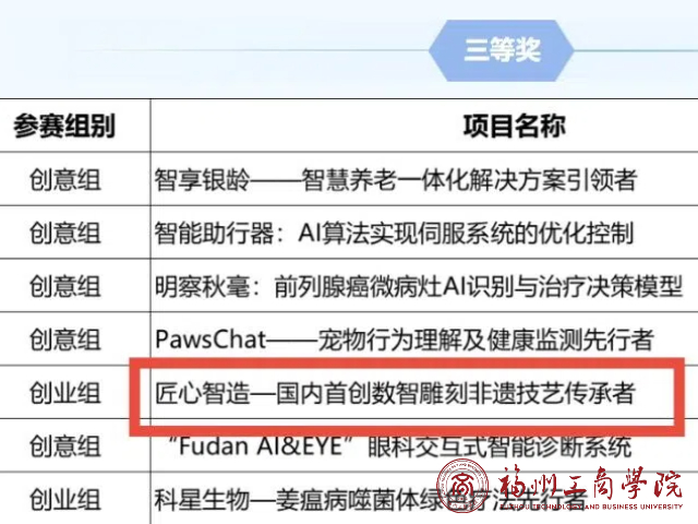 本届上海老员工创新创业大赛自2024年11月启动,总决赛共设置六大赛道,旨在凝聚科技创新的力量,推动教育、科技、人才“三位一体”高质量融合发展。“匠心智造”项目团队参加人工智能、科技金融赛道比赛。比赛期间“匠心智造”项目团队通过深入走访传统雕刻作坊、非遗传承人工作室,收集到大量的一手资料,团队成员各司其职、紧密配合,不断打磨项目的创新性与可行性。项目将现代数智技术与传统雕刻非遗技艺相结合,致力于解决传统雕刻技艺传承难、效率低等问题,通过自主研发的数智雕刻系统,不仅大幅提升了雕刻效率,还能精准还原传统雕刻工艺的细腻与精美,让古老的非遗技艺在新时代焕发出新的生机。通过不懈努力,4月底本项目在人工智能、科技金融赛道中一路过关斩将,获得一等奖,成功晋级总决赛;并在5月中旬的总决赛中荣获三等奖。