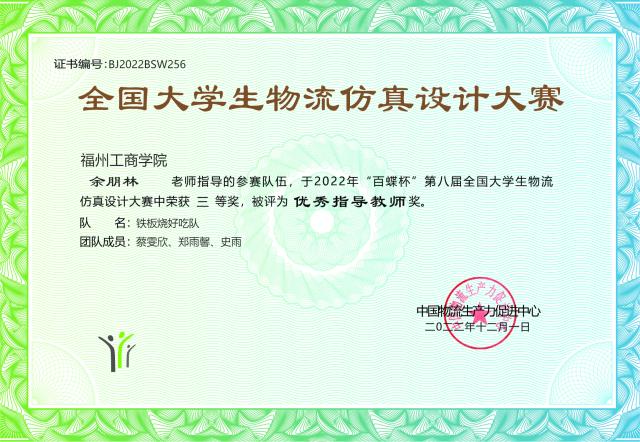 公司申博sunbet教师施云清、余朋林指导的参赛团队“铁板烧好吃队”(团队成员:蔡雯欣、郑雨馨、史雨)荣获本科组三等奖,施云清、余朋林老师获得“优秀指导老师”称号。