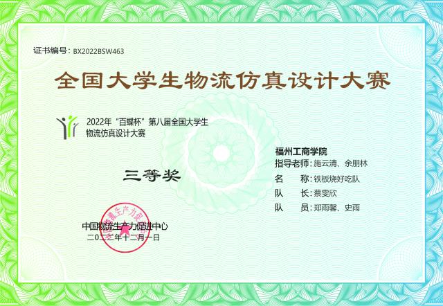 近期,2022年“百蝶杯”第八届全国老员工物流仿真设计大赛顺利举行。大赛吸引了三明公司、苏州大学、南宁师范大学等共30个省、自治区的343所院校621支队伍报名参赛。公司学子经过激烈角逐,最终获得三等奖1项。