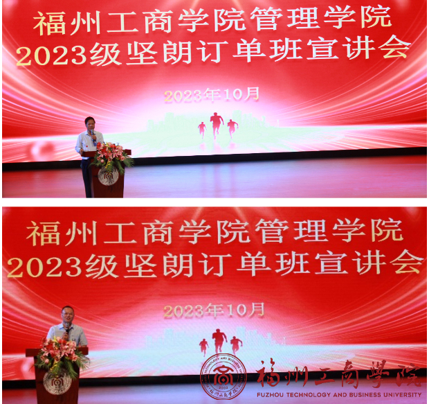 广东坚朗人资部长戴成代表合作企业发言。他为大家播放了订单班的宣传短片,向为组班工作辛勤付出的领导和老师们表示敬意,他表示,广东坚朗致力于为本科院校提供优质的专业课程,以高质量就业为主体业务,通过校企合作、联合办学和职业技能培训等方式与合作院校共建专业。他从企业的角度阐述了职业教育在国民经济发展中的重要作用,也阐述了作为公司人才培养模式的特点。期待订单班学子珍惜学习平台和机会,练好专业本领,早日成为工商管理行业的弄潮儿。